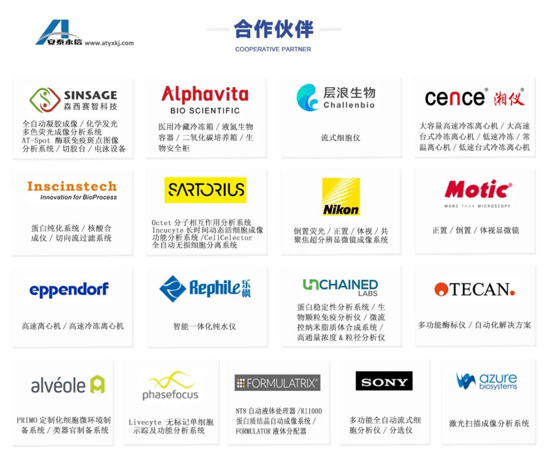 血液發育與疾病論壇: 葉麗林(第三軍醫大學)、趙維蒞(上海交通大學附屬瑞金醫院)、彭軍(山東大學齊魯醫院)、潘巍峻(中國科學院營養與健康所)、洪登禮(上海交通大學醫學院)、岳銳(同濟大學)、李忠俊(陸軍軍醫大學第二附屬醫院)、李專(南方醫科大學) 生殖發育與疾病論壇: 胡志斌(南京醫科大學)、史慶華(中國科學技術大學)、王紅艷(復旦大學生殖與發育研究院)、王磊(復旦大學)、張華(中國農業大學)、李偉(中國科學院動物研究所)、孫瑩璞(鄭州大學第一附屬醫院)、宋偉(中國醫學科學院基礎醫學研究所) 康定論壇: 景乃禾(廣州實驗室)、朱大海(廣州生物島實驗室)、楊曉(軍事科學院軍事醫學研究院生命組學研究所)、羅凌飛(復旦大學)、曾藝(中國科學院分子細胞科學卓越創新中心)、黃勛(中國科學院遺傳與發育所)、高翔(南京大學)、彭金榮(浙江大學)、林鑫華(復旦大學) 前沿技術與學科交叉論壇: 鐘濤(華東師大)、林金鐘(復旦大學)、 李大力(華東師大)、王永明(復旦大學)、葉海峰 (華東師大)、孫永華 (中科院水生所)、薛建新(華西醫院)、陳崇(四川大學)、莫顯明(華西醫院) 早期胚胎發育與疾病論壇: 湯富酬(北京大學)、范衡宇(浙江大學)、何愛彬(北京大學)、劉念(清華大學)、向波(四川大學華西醫院)、劉江(中國科學院生物物理所)、高亞威(同濟大學)、丁俊軍(中山大學)、陳靜(四川大學華西醫院) 心、肺、血管發育與疾病論壇: 王婧(中國醫學科學院基礎醫學研究所)、寧文(南開大學)、蘇梟(中國科學院上海巴斯德研究所)、華益民(四川大學華西第二醫院)、隋鵬飛(中國科學院分子細胞科學卓越創新中心)、趙揚(北京大學)、陳靜海(浙江大學)、朱偉(浙江大學)、李中翰(四川大學) 神經發育與疾病論壇: 張永清(中國科學院遺傳與發育所)、陳蕾(四川大學華西醫院)、徐廣銀(中國神經科學學會)、張杰(廈門大學)、吳海濤(軍事醫學研究院)、朱鈴強(華中科技大學同濟醫學院)、邵振華(四川大學)、雷鵬(四川大學) WLLA論壇報告人: 徐素宏(浙江大學)、張晶晶(廣東醫科大學)、劉君(北京大學)、王樂韻(廈門大學)、范小英(廣州實驗室)、李會玲(南京醫科大學)、李琳(南方醫科大學)、馬艷妮(中國醫學科學院基礎醫學研究所)、郭紅山(浙江大學)、艾珊珊(南方醫科大學)、樊雪梅(上海交通大學)、周長萍(中國醫學科學院輸血研究所)、王旭(中國醫學科學院輸血研究所)、鄧東(四川大學華西第二醫院)、龍海霞(陸軍軍醫大學第二附屬醫院)、朱勇(重慶醫科大學)、易萍(重慶醫科大學附三院)、張曜耀(四川大學華西第二醫院)、盧克峰(四川大學) ![]() 安泰永信科技是國內外多種生命科學儀器的重點經銷商,市場實力雄厚,已合作多款品牌科研儀器:賽智全自動凝膠/化學發光/多色熒光成像分析系統、賽智酶聯免疫斑點圖像分析儀/電泳設備/全自動蛋白印跡處理系統、Tecan多功能酶標儀/全自動液體處理站、松洋醫用冷藏冷凍箱/-90℃醫用超低溫保存箱/-86℃醫用超低溫保存箱/液氮生物容器/二氧化碳培養箱/生物安全柜、湘儀大容量高速冷凍離心機/大容量高速臺式冷凍離心機/大容量低速冷凍/常溫離心機/低速臺式冷凍離心機、eppendorf高速離心機/冷凍離心機、英賽斯蛋白純化系統/大規模核酸合成儀/自動化切向流過濾系統、樂楓Genie G 智能一體化純水儀/Genie PURIST 智能型超純水儀/Genie U 智能一體化純水儀、層浪流式細胞儀、Motic倒置生物顯微鏡/熒光顯微鏡/正置顯微鏡/體視顯微鏡、Nikon倒置熒光顯微鏡/正置顯微鏡/共聚焦顯微鏡/超分辨顯微鏡、Azure激光掃描成像系統/Cielo qPCR儀、Sartorius Incucyte長時間動態細胞監測分析系統/Octet生物分子相互作用分析系統/iQue3超高通量流式智能篩選系統/CellCelector全自動無損細胞分離系統/生物反應器/澄清過濾系統/層析系統、PRIMO定制化細胞微環境制備系統、FORMULATRIX NT8 納升級蛋白質自動點晶工作站/Rock Imager 1000高通量蛋白質晶體自動觀測系統/Formulator蛋白結晶篩選自動分液工作站/μPULSE - TFF 全自動切向流微量超濾系統、非鏈多參數蛋白穩定性分析系統/生物顆粒免疫分析儀/Honeybun多通道粘度快速分析儀、SONY全光譜型流式細胞分析儀/分選儀、Livecyte單細胞示蹤及功能分析系統等生命科學儀器。 公司以成熟的銷售、商務和技術服務團隊為主,團隊成員專業、誠信、有活力,同時具有十余年的實驗室設備專業技術背景和豐富的行業經驗。 我們堅定“科技服務為先,誠信經營為本”的價值理念,為員工謀發展,為團隊創價值,致力于為中國生命科學研究和生物醫藥研發貢獻力量,砥礪前行!