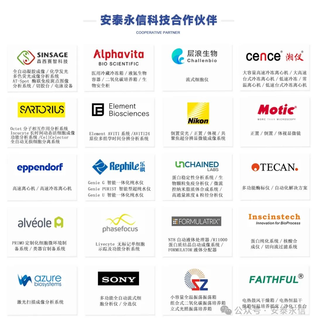 安泰永信科技(廣州)有限公司是一家專業的生命科學儀器設備服務商,致力于提供生物醫學實驗室的整體解決方案,產品和技術覆蓋分子、蛋白、細胞、組織、小動物、生物工藝和自動化等領域,與全國各大高校、國家級/省級重點實驗室、科研院所及醫院等都有密切合作。安泰永信科技是國內外多種生命科學儀器的重點經銷商,市場實力雄厚,已合作多款品牌科研儀器:賽智全自動凝膠/化學發光/多色熒光成像分析系統、賽智酶聯免疫斑點圖像分析儀/電泳設備/全自動蛋白印跡處理系統、英賽斯蛋白純化系統/大規模核酸合成儀/自動化切向流過濾系統、Motic倒置生物顯微鏡/熒光顯微鏡/正置顯微鏡/體視顯微鏡、Nikon倒置熒光顯微鏡/正置顯微鏡/共聚焦顯微鏡/超分辨顯微鏡、Tecan多功能酶標儀/全自動液體處理站、非鏈多參數蛋白穩定性分析系統/生物顆粒免疫分析儀/Honeybun 多通道粘度快速分析儀、PRIMO定制化細胞微環境制備系統、Livecyte實時細胞功能及單細胞行為分析系統、SONY全光譜型流式細胞分析儀/分選儀、Sartorius Incucyte長時間動態細胞監測分析系統/Octet生物分子相互作用分析系統/iQue3超高通量流式智能篩選系統/CellCelector全自動無損細胞分離系統/生物反應器/澄清過濾系統/層析系統、eppendorf 高速離心機/冷凍離心機、SII新一代超靈敏小動物活體成像系統、Molecubes小動物臺式 PET/SPECT/CT 成像系統、Bruker高分辨率活體 X 射線微型計算機斷層掃描系統(micro-CT)、OptiScan FIVE2小動物活體共聚焦成像系統、Azure激光掃描成像系統/Cielo qPCR儀、FORMULATRIX NT8自動液體處理器/RI1000蛋白質結晶自動成像系統/FORMULATOR液體分配器等生命科學儀器。 公司以成熟的銷售、商務和技術服務團隊為主,團隊成員專業、誠信、有活力,同時具有十余年的實驗室設備專業技術背景和豐富的行業經驗。我們堅定“科技服務為先,誠信經營為本”的價值理念,致力于為中國生命科學研究和生物醫藥研發貢獻力量,砥礪前行!