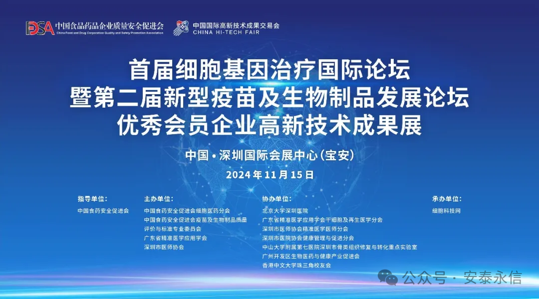 2024年11月14-16日,在這金秋送爽的季節,第二十六屆中國國際高新技術成果交易會(下稱“高交會”)在全球最大的會展中心——深圳國際會展中心隆重開幕。在高交會的生物醫藥板塊中,由中國食品藥品企業質量安全促進會(簡稱:中國食藥安全促進會)細胞醫藥分會、中國食藥安全促進會疫苗及生物制品質量評價與標準專業委員會、廣東省精準醫學應用學會、深圳市醫師協會聯合主辦的首屆細胞基因治療國際論壇暨第二屆新型疫苗及生物制品發展論壇和中國食藥安全促進會優秀會員企業高新技術成果展(簡稱“兩會一展”)也如期盛大開幕!